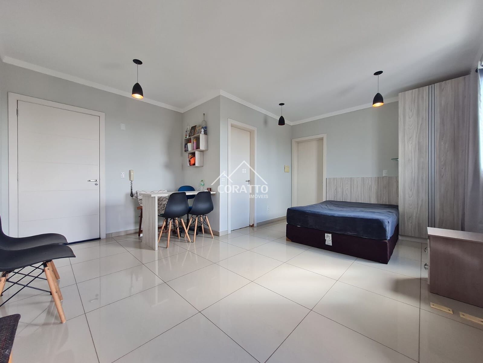 Composto por 1 dormitório, sala de estar/jantar, cozinha com área de serviço integrada e banheiro social.