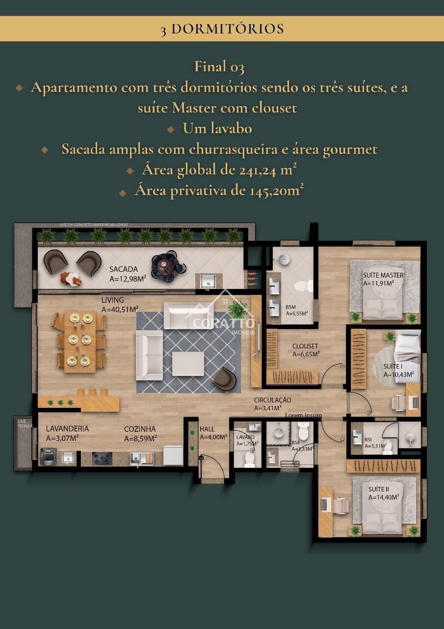 3 Dormitórios, sendo 3 suítesÁrea Privativa