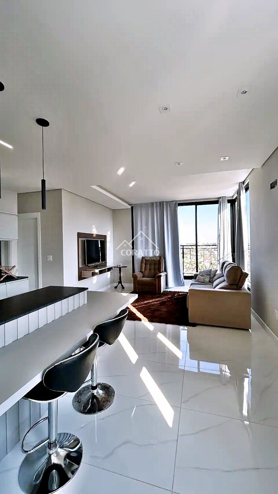 Composto por 1 dormitório, sala de estar, cozinha, banheiro social, área de serviço e box de garagem.