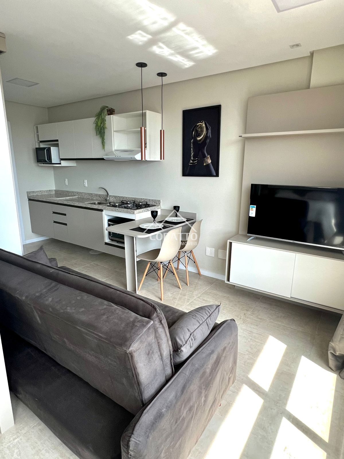 Composto por 1 dormitório, sala de estar, cozinha, área de serviço e banheiro social. Com eletrodomésticos e decoração.